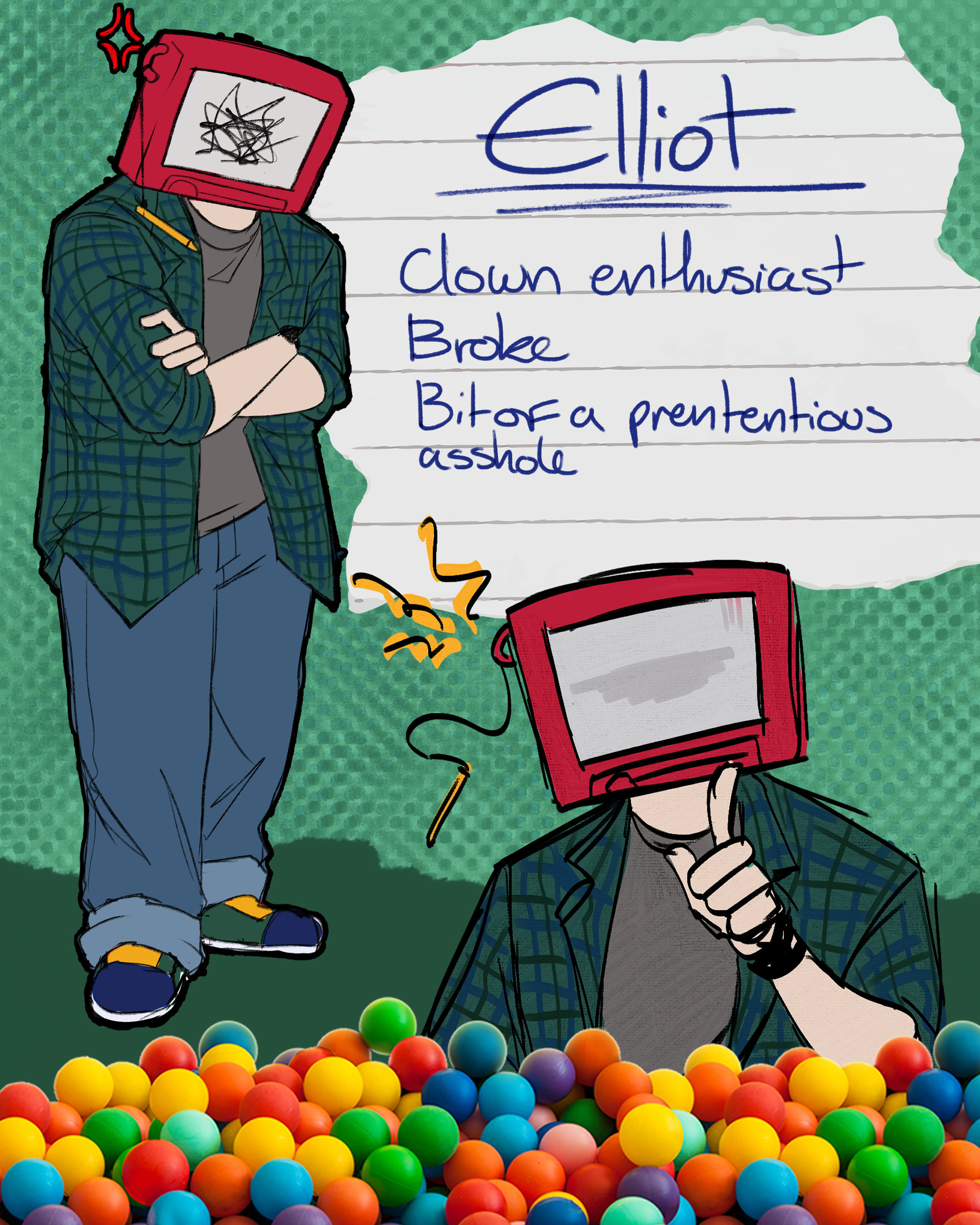 Funfact: Elliot was going to be an original character before I scrapped them but they ended up staying as a self-insert for Dialtown instead.